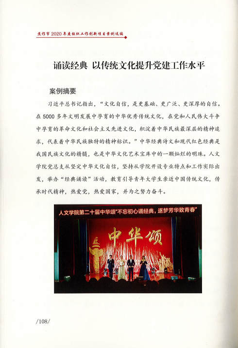人文學院黨總支結合學院開設專業的特點,舉辦了以“祖國頌”、“國韻流觴”、“盛世華章”、“時代春雨——焦作大學學雷鋒詩歌誦讀會”、“雅言清韻,禮贊中華”、“赤子心·中國夢”、“禮敬中華·傳承經典”、“不忘初心誦經典,逐夢芳華致青春”等為主題的《中華經典誦讀,傳承中國文化》系列活動,緊扣時代精神,結合黨建主題,通過大學生和專業教師對經典作品多形式的演繹,在展示中華優秀傳統文化之美的同時,增強了師生的民族自豪感和認同感。2021年是建黨一百周年,各黨總支(直屬黨支部)要以此為契機,繼續以“強基礎、創特色、促發展”為指導,充分發揮品牌的輻射、引領作用,促進黨建工作科學規范、富有生機、充滿活力、卓有成效,以高質量黨建促進學校高質量發展,為建黨一百周年獻禮。