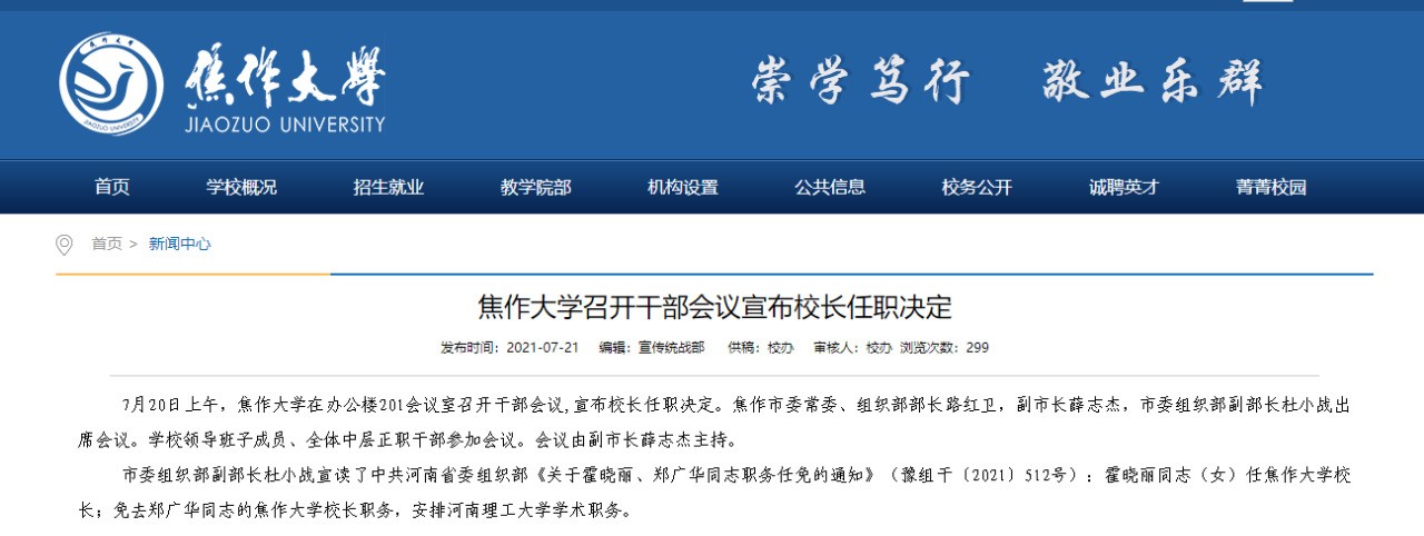 2021年7月25日,焦作日報以《霍曉麗同志(女)任焦作大學校長》為題,對我校新任校長霍曉麗任職情況進行了報道。內容如下: